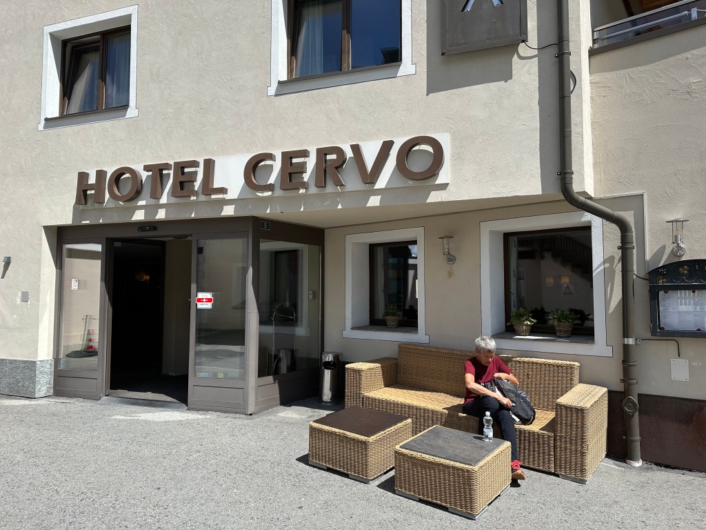 Vi njöt i fulla drag uppöver. Resan tog ca 3,5 timmar från Zürich till St Moritz. Där stod en passande buss vid järnvägsstationen. 9 km till hotell Cervo i Sils. Den kvinnliga chauffören verkade vara ute efter någon rekordtid på sträckan. Rena bussrallyt, men fram kom vi. Hyggligt trötta efter en lång resdag från Mora.
