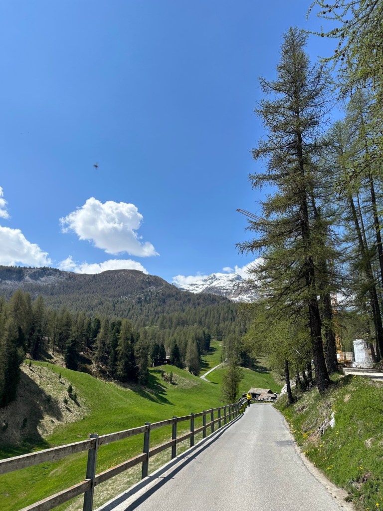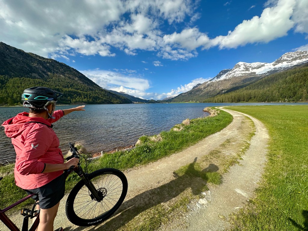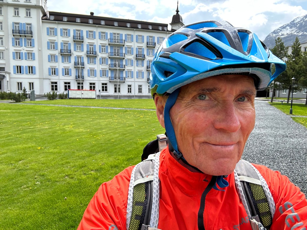 På själva ”högtidsdagen” siktade vi in oss på en cykeltur. Bort till Pontresina via St Moritz. Kanska upp i Val Roseg. Förresten, cyklar var lite knepiga att få tag på då det var försäsong. Men en sportaffär just från Pontresina nappade och körde två bra mountainbikes till hotellet. Vi har faktiskt hyrt cyklar av dom för ca 12-15 år sedan. En vänlig dam på turistbyrån i Sils hjälpte oss. Här har man turistbyrå öppen hela dagarna, även under lågsäsong, på en så liten ort. Jag tror inte dom har varit i närheten av idén att stänga turistbyrån och överlämna det hela till nätet. Åter till cykelturen. Vi börjar med några startbilder.