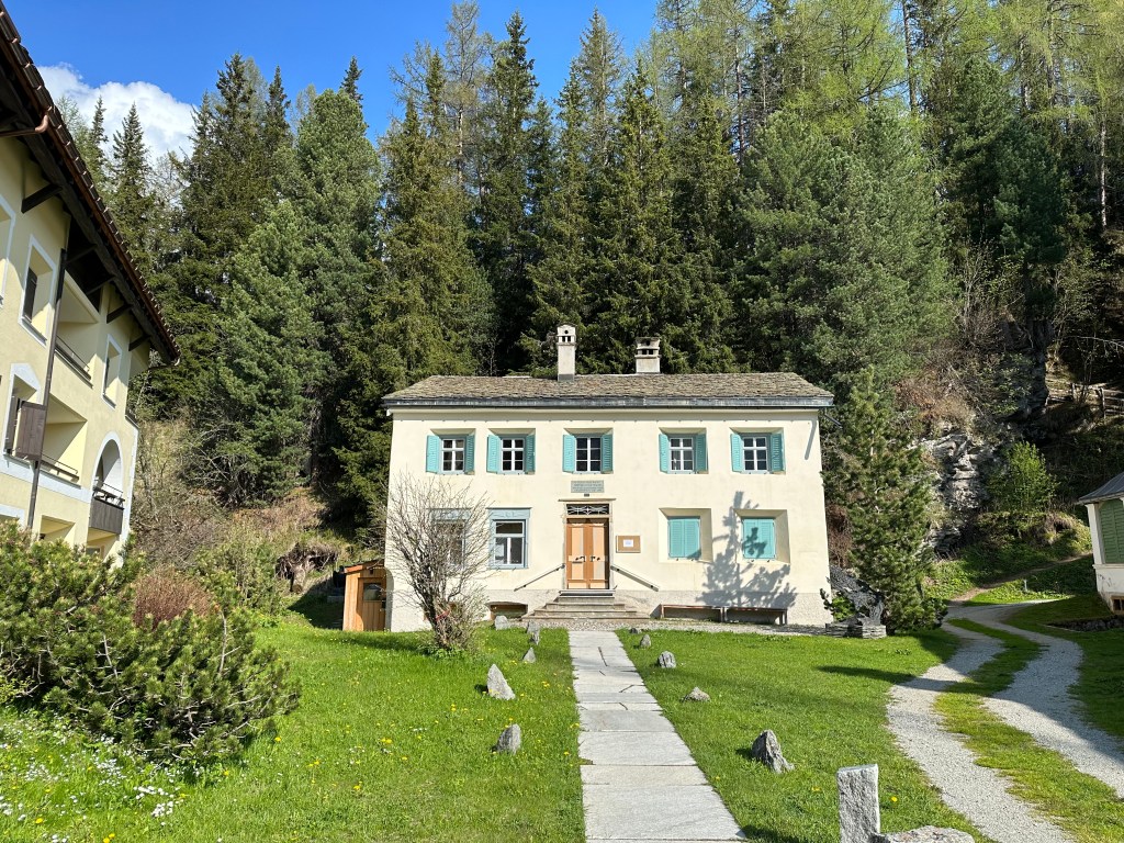 Vår första utflykt blev en promenad ut på en halvö i SilerSee. Ute på udden hade filosofen Friedrich Nietzsche (1844 – 1900) en tankesten. Han höll till i Sils under ett antal somrar. Han var nog aningen speciell men hade många ”tankeföljare”. Han var väldigt kritisk mot vetenskapen och kristendomen. Läs om honom om ni blev intresserade. Det finns ett museum om honom i Sils. Granne till vårt hotell.