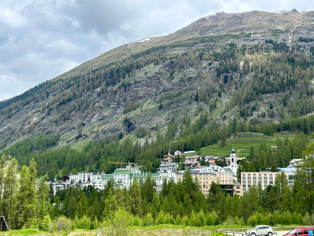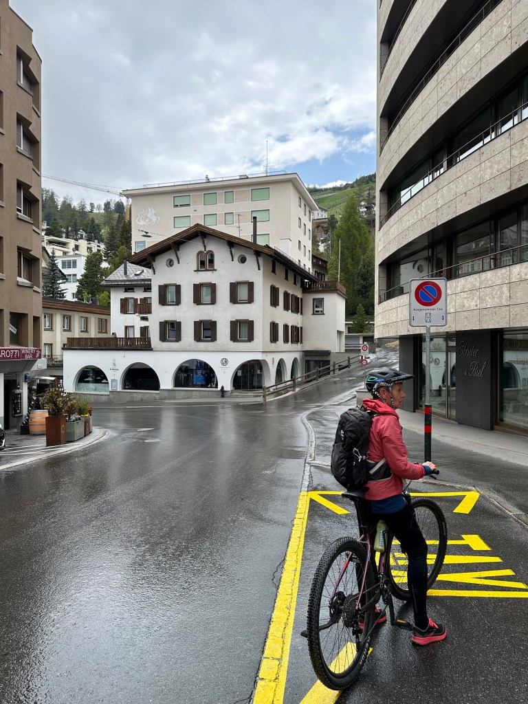 Vi var tveksamma, skulle vi ta samma väg hem som dit. Det blev ett annat val, över Samedan. Det visade sig vara lite oturligt. Cykelvägen var avstängd p.g.a. vägbygge och en rejäl regnskur kom. Det fick gå. Vi kände igen oss i Samedan där vi bott. Vi fick några extra rejäla motlut bort mot St Moritz där vi fick passera i övre byn. Den lite mer eleganta delen av samhället. ”Findelen” helt enkelt, det syns på affärerna och husen. Före centrum däruppe gick vi upp för en rejäl backe, en rodelbanan från äldre tider där det varit VM-tävlingar. Det kom två hurtiga norrmän och cyklade förbi oss som gick. Men de var vältränade och 30 år yngre.