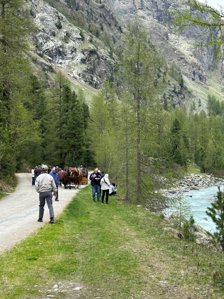 Dit ska vi, mot St Moritz.Vid entren til Val Roseg.PontresinaVal Roseg med japaner på tur.Val Roseg