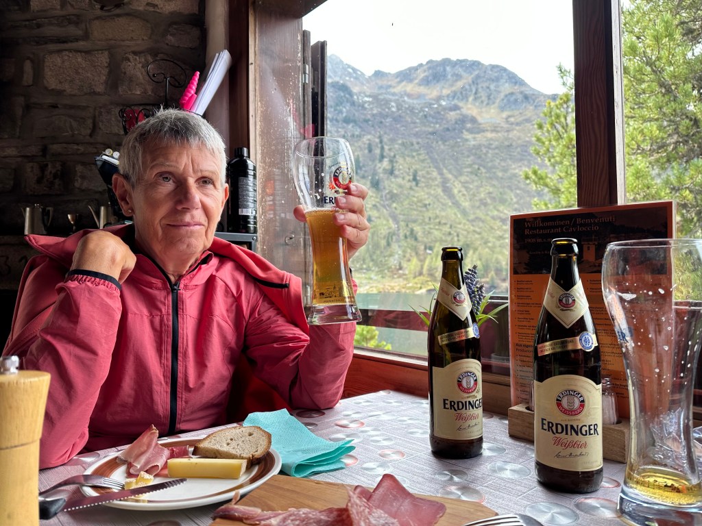 Vi hade upparbetat en viss hunger och det skulle bli gott med något i magen. De hade några goda brickor med diverse kött och ost och en kall öl till av märket Erdinger. Problem uppstod vid betalning. De tog inte kort. Det löstes med något slags ”kvitto” där de skrev upp summan och företaget. Vi skulle gå in på posten så kunde man betala där mot uppvisande av kvittot. Vi kunde naturligtvis struntat i det, fattas bara, när de så väl litar på folk. Vet inte om lösningen finns i Sverige, att vi så väl litar på folk. God mat och vi såg oss om, det här var en gammal Alp/fäbod sedan riktigt gamla tider. Vi gick runt sjön och ner till bussen som punktligt dök upp. Punktlighet hör Schweiz till liksom kanske motsatsen Sverige – om man ska vara lite elak.