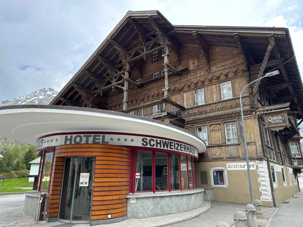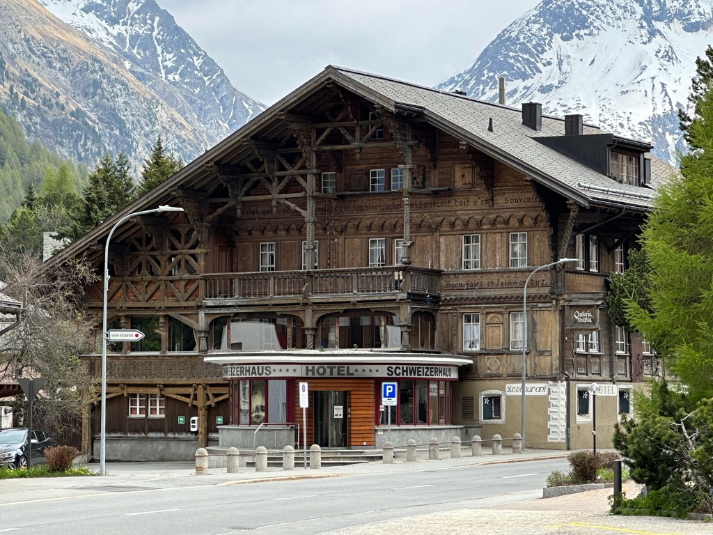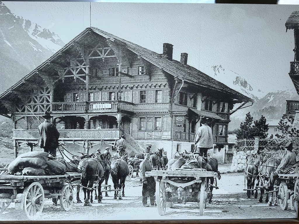 Vi satt och väntade på bussen i den lilla byn Maloja. Dit många träningscyklar i serpentinerna från Italienhållet. Och som sagt startplatsen för det stora skidloppet Engadin Ski Marathon. Jag gick runt och kollade lite på hus m.m. Jag såg något lite märkligt, en riktigt gamma byggnad som var bevarad, men numera försedd med en enligt mig helt opassande entré. Annars ser jag att dom är mån om att behålla gamla kulturbyggnader för att behålla historien om samhället. Viktigt tycker jag. Se på bilderna på det gamla hotellet/restaurangen. En riktig gammal bild fanns i ett fönster vid busshållplatsen.