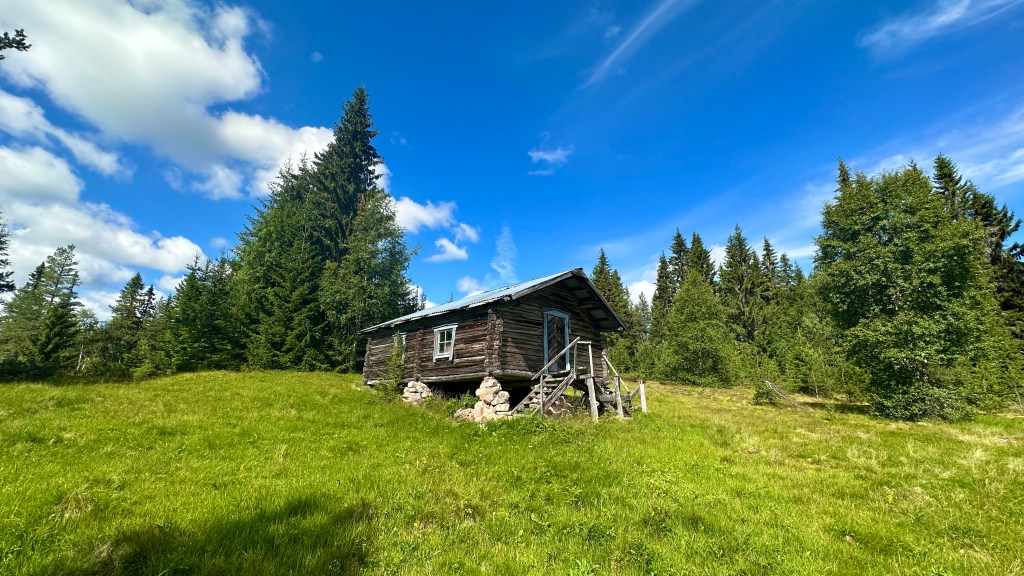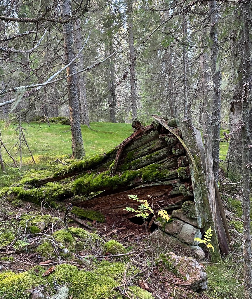 Raststugan/övernattningskojan dyker upp i Blomtäkts fäbodar. Hit gick man med korna förr i tiden. En del äldre hus har gett upp och blir ett med naturen.