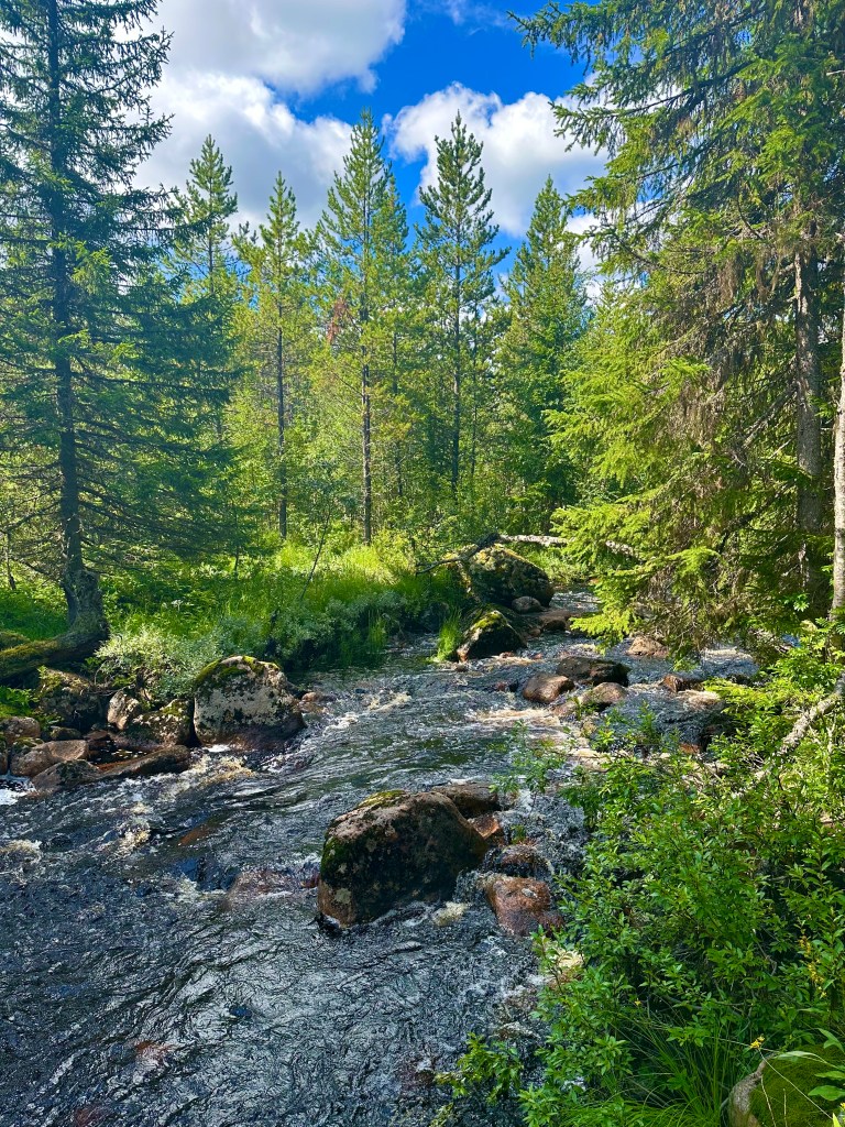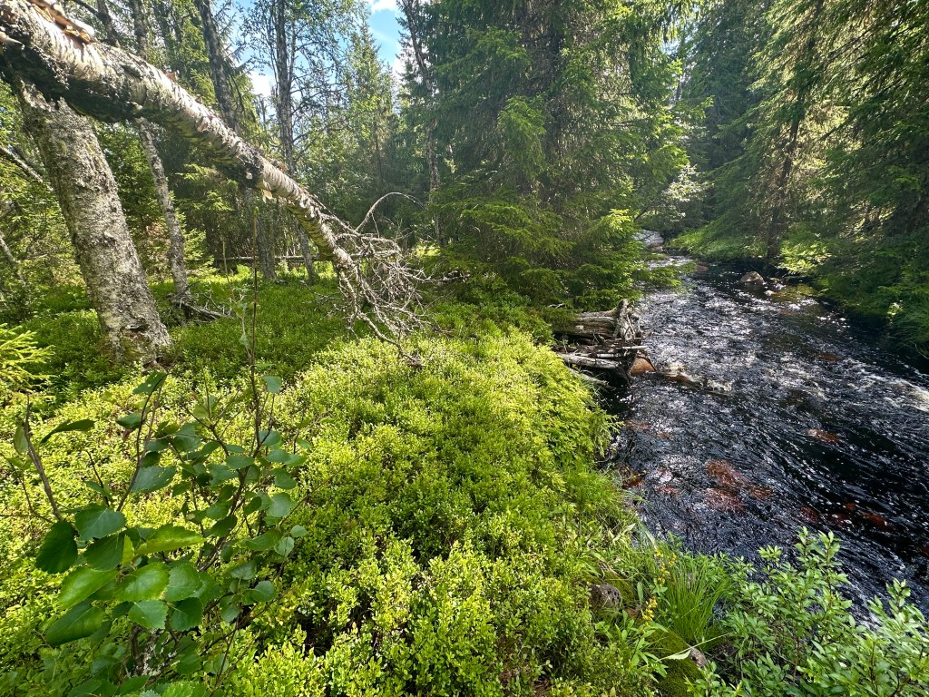 Jag knallade runt på vallen. Väldigt fint där denna dag. I söderläge svagt sluttande mot Kölån. Ån som väl är grunden för val av platsen. Förresten så hittade jag på appen ”Fornfynd” en blästbrukslämning, rester av två blästerugnar. Daterade av riksantikvarieämbetet Järnålder – medeltid. Kölån ringade så fint in fäbodarna och mycket vatten var det så trivsamt brus hördes. Kölån rinner in i Ulvsjö och vidare in i Sexån som mynnar ut i Orrmosjön i Härjedalen. Några bilder från ån.
