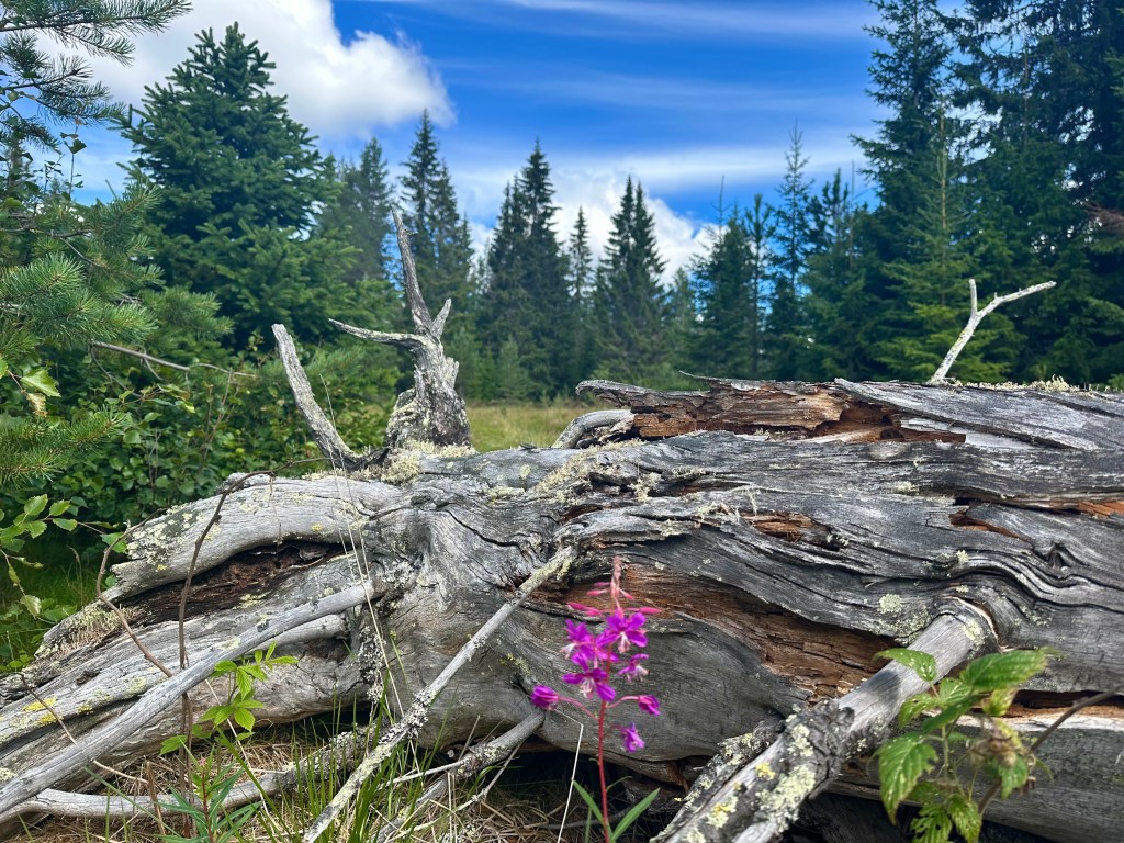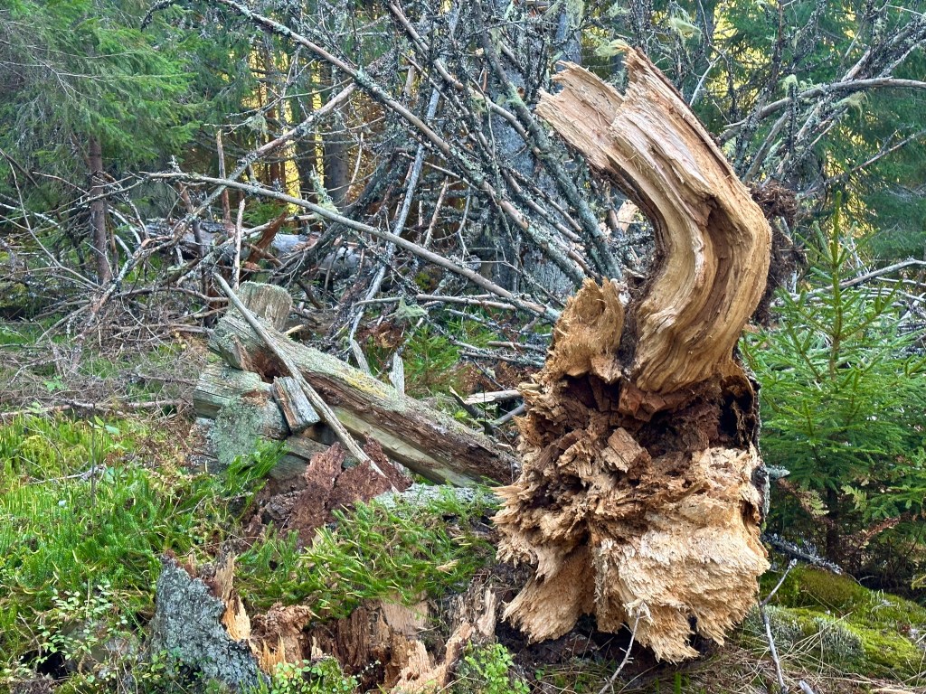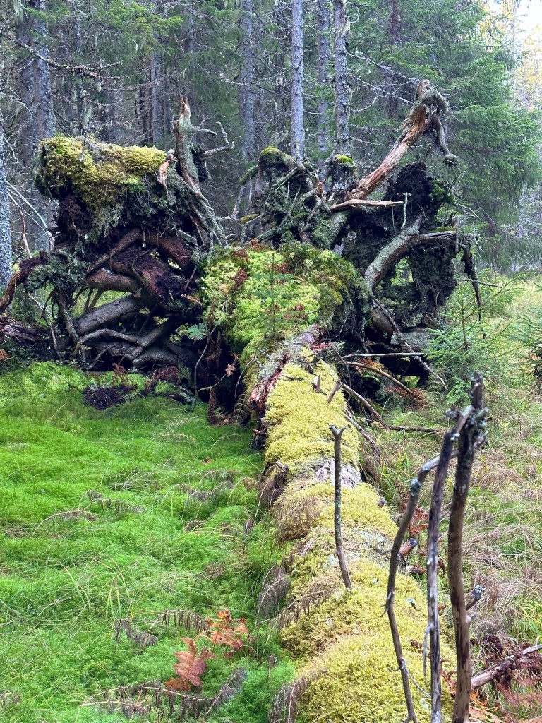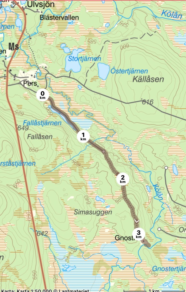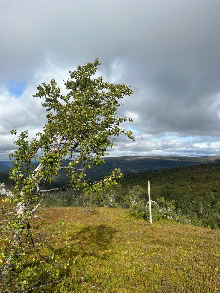 Ca 3-4 km till bilen. Ska bli skönt med en ”spurt. Några foton blev det även på det avsnittet, som egentligen borde förstärkas lite i markeringarna. Visst hittar man, men emellanåt dyker viss osäkerhet upp. Det ska bättras på enligt Per. Honom träffade jag faktisk vid vägen upp till telemasten på N Oradtjärnberget. Han var ute och satte upp nya reservatskyltar m.m. Fick jag börja om mitt liv så var det ett jobb jag skulle söka. Han misstänkte nog att jag kunde dyka upp där i storskogen. Vilket jag gjorde. Från det mötet blev leden perfekt, lättgången och välmärkt.