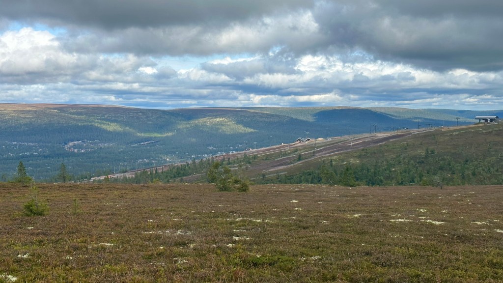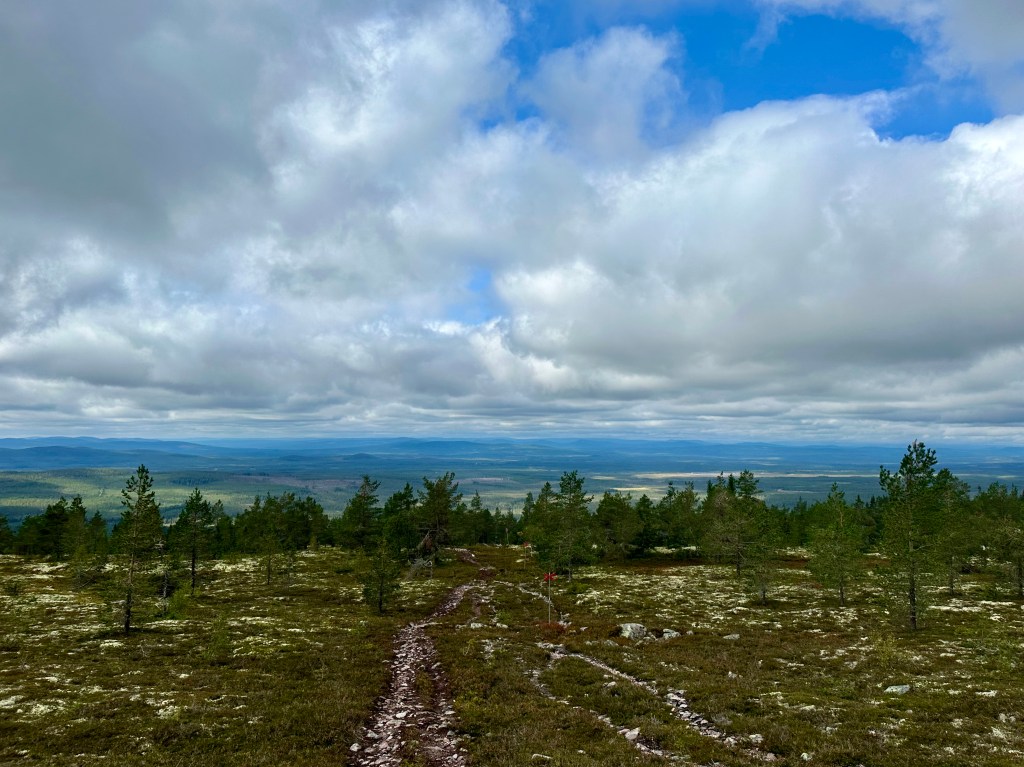 Strax för slogboden vid Tunturi gick det en markerad led till vänster. Vi visste inte vart, men kollade, och svaret var upp till Tunturiberget, 652 m.ö.h. Bara 300 m bort. Det får bli nästa gång.