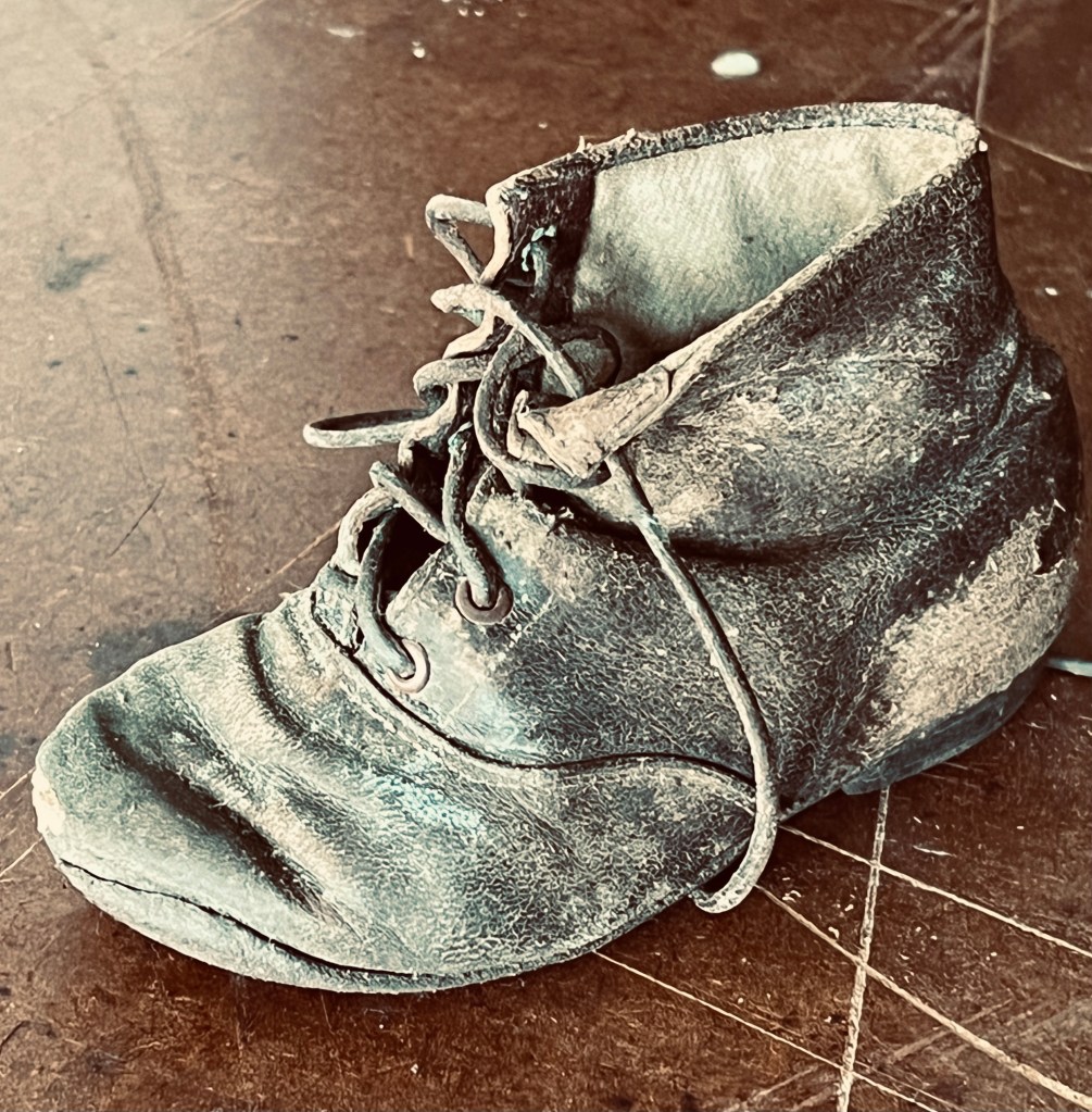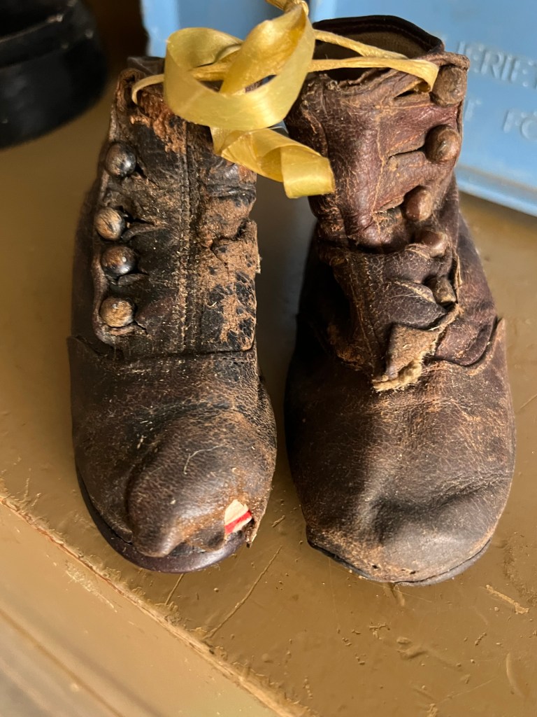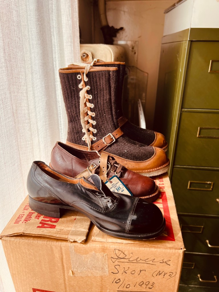 Jag fastnade lite extra för dessa barnskor. Riktigt små och även mycket nötta. Skor var en lyx förr och farmor berättade när de gick till Mora på konfirmationsundervisning så fick dom inte ta på sig skorna förrän de kommit till Morkarlby. De fick inte nötas. Det kan ju rent av vara far mins skor det här som Albin hittat och lagt ut i affären, vad vet man?