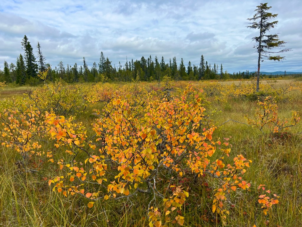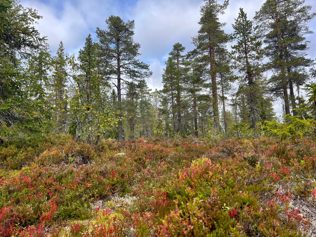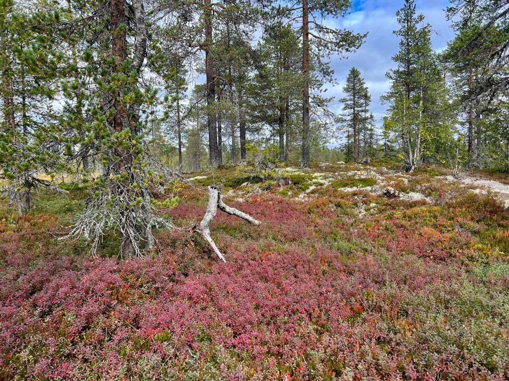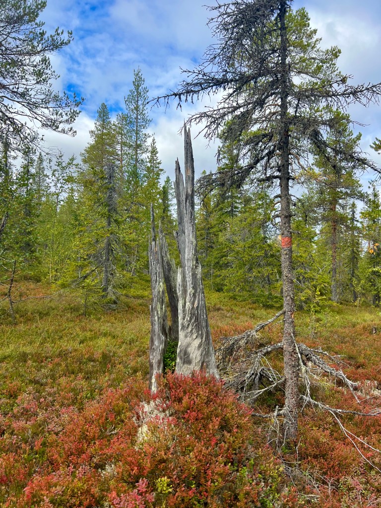 Motiv finns för den naturintresserade. Höstfärgerna börjar komma och kläda marken och träden så fint. Jag träffade en person vid ICA Olsson som undrade om jag inte var rädd för björn. Förresten sa hon, är det inte älgjakt däruppe nu. Visst har jag respekt för björn, men rädd, absolut inte. Jägare såg jag inte till och jag fick väl vända om dom rådde mig till det. Nej, ripor, orre, korp, några småfåglar var det liv jag såg och hörde. När vi skidade såg vi fler torrakor, dom finns mer ute runt myrarna och på ”holmar”ute på myrarna. Men visst såg jag gammelskog så jag blev nöjd.